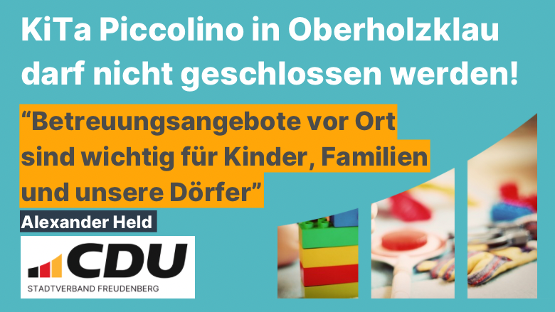Zusammenfassend fordert die CDU Freudenberg eine rasche Zusammenarbeit aller Verantwortlichen – von der Kommune, über den Träger, das Kreisjugendamt bis hin zur Landesregierung, um eine tragfähige Lösung für den Erhalt der Kita Piccolino, aber auch aller anderen Kindertagesstätten zu finden. "Wir müssen alle Kitas vor Ort zukunftsfähig aufstellen, damit Familien eine verlässliche Betreuungsstruktur und eine echte Hilfe im Alltag haben. Gerade kleine Einrichtungen spielen eine zentrale Rolle für das Zusammenleben im Dorf", so Alexander Held abschließend.